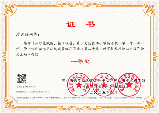 梁红老师的论文《依托数据循证,促进师生发展——基于人工智能的教师语言优化与学生评价画像实践》,在湖北省第二十届“教育技术理论与实践”论文评选中喜获一等奖。该论文同时入选2025年湖北省数字化赋能教育管理高质量发展应用典型案例。廖文静老师的论文《智能赋能,精准提质:基于大数据的小学英语教—学—练—测—评—管一体化动态闭环构建策略》亦喜获一等奖。此外,贺迪澳同学在蔡运林老师的指导下,在2025年湖北省学生数字素养提升实践活动中荣获计算思维项目三等奖,体现了学校在全面提升师生信息素养方面的综合成效。