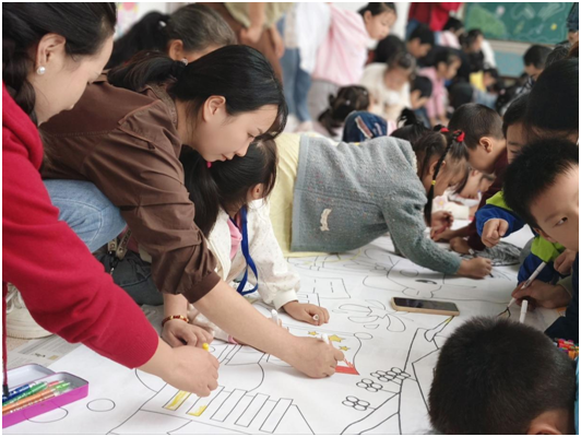 大班组,一幅巨型画卷铺展在地面,孩子们在家长和老师的陪伴下,手持彩笔,兴致勃勃地为画卷填充色彩。他们用稚嫩的笔触描绘出国旗、明月、玉兔等元素,将对祖国的热爱和对中秋的期盼都融入这幅充满童趣的集体创作中,每一笔都凝聚着亲子间的温情与对双节的美好祝愿。