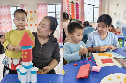 活动现场热闹非凡,处处洋溢着欢乐的氛围。小班组、中班组亲子家庭全神贯注地投入创作:有的用彩泥精心塑造出象征团圆的月饼和五星红旗的图案,小手与大手默契配合,将对节日的祝福揉进斑斓的彩泥里;有的亲子搭档脑洞大开,用纸张搭建出印有国旗的“航天火箭”,在创意拼接中传递着对祖国航天事业的崇敬与对未来的憧憬;还有的家庭专注于制作传统灯笼,红色的灯笼框架上,家长耐心指导孩子粘贴装饰,一盏盏饱含心意的灯笼逐渐成型,仿佛点亮了浓浓的节日韵味。