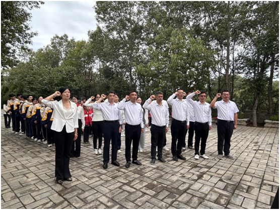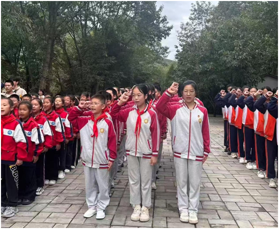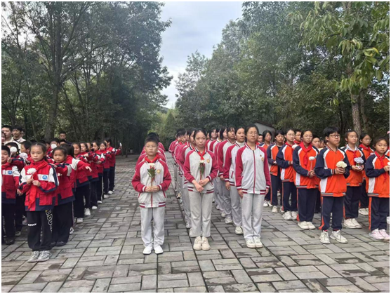 参与活动的师生乘车到达九口堰,大家怀着庄重的心情,步行前往革命烈士纪念碑。师生们整齐地站在纪念碑前向革命先烈默哀3分钟,缅怀先烈的英勇事迹。学生代表向烈士纪念碑敬献花篮,教联体领导整理花篮缎带,表达对革命先烈的哀悼和敬意。少先队员、团员献歌《我们是共产主义接班人》。少先队员、团员敬礼及献花。党员、团员、少先队员在党团队旗下重温入党入团入队誓词,还举行了集体诵读活动。