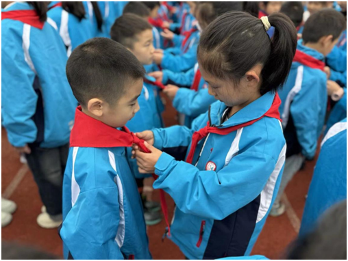 当日上午,校园内队歌嘹亮,队旗格外鲜艳。在庄严的出旗曲中,旗手们迈着矫健的步伐,高举中国少年先锋队队旗入场,全体队员齐声高唱《中国少年先锋队队歌》,嘹亮的歌声表达了队员们对少先队组织的热爱与向往。仪式上,高年级的优秀少先队员代表为新队员佩戴上鲜艳的红领巾。当第一条红领巾在胸前飘扬,新队员们脸上洋溢着激动与自豪的笑容。他们高举右拳,在队旗下庄严宣誓,铿锵的誓言在校园上空回荡,彰显着新时代少年儿童肩负使命、奋勇向前的决心。
