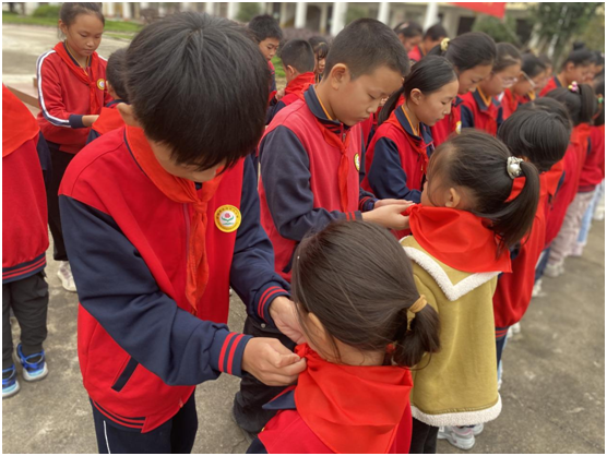 仪式上,队旗飘扬,队歌嘹亮。学校宣布了新队员名单,高年级的哥哥姐姐们认真地为新队员佩戴上鲜艳的红领巾。这是光荣的传递,也是责任的开始。