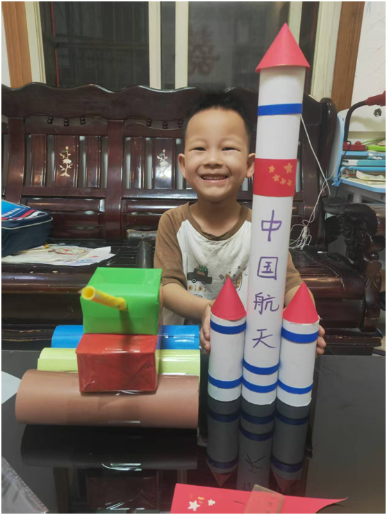 当日清晨,孩子们怀着喜悦的心情将作品带入校园,幼儿园教学楼走廊、活动室瞬间变身 “双节创意展厅”。栩栩如生的手工作品沿展线依次陈列,吸引师生驻足观赏。孩子们化身 “小小讲解员”,兴奋地向同伴介绍自己与家长的创作思路:“这是天安门,我长大要去北京看它!”“这是火箭,能带着我们的梦想飞向太空!” 稚嫩的话语里满是对祖国的热爱与对未来的向往。