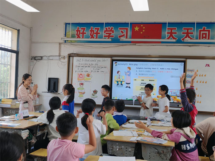 接着,柳林镇第一小学刘丹老师与第二小学宋慧惠老师聚焦人教版四年级上册《Unit 1 Helping at home Part B Let's talk》,演绎出风格迥异的“同课同构”课堂教学。刘老师以“问题链”为课堂主线,紧扣“家务劳动”主题,构建起“情境导入—新知探究—语言运用—拓展延伸”的递进式问题体系,让对话教学从“碎片化问答”走向“结构化思维”。宋老师则以生活化问题为切入口,迅速激活学生已有经验;新知探究环节,设计“What can you do ?Can you cook?”等基础性问题,引导学生聚焦对话核心句型;拓展延伸环节,以“What can you do for your family?How can you help your family?How do you feel?”为开放性问题,鼓励学生小组合作、踊跃表达,让语言学习与生活实践深度融合。