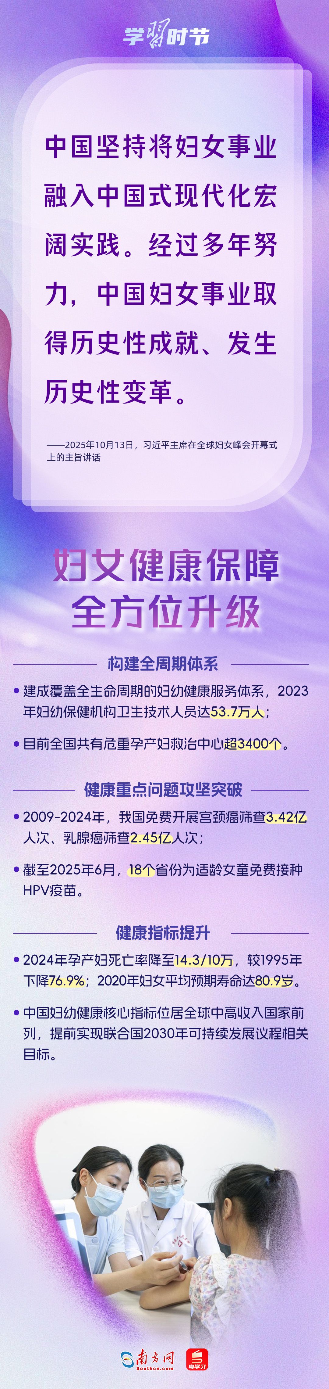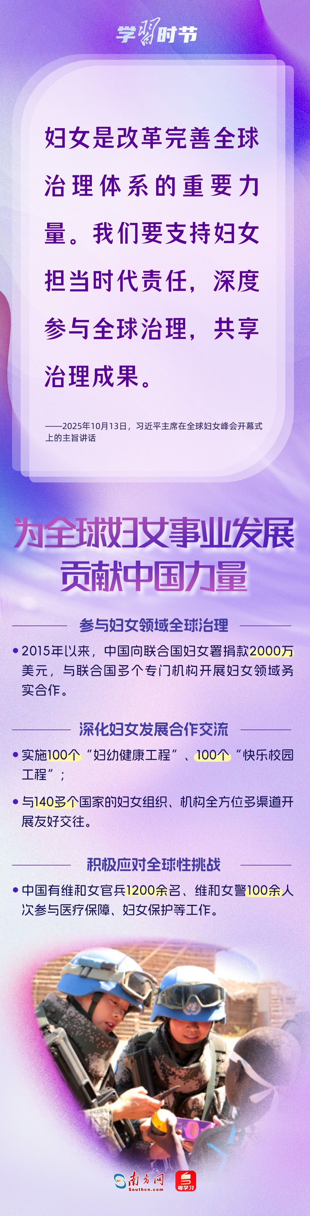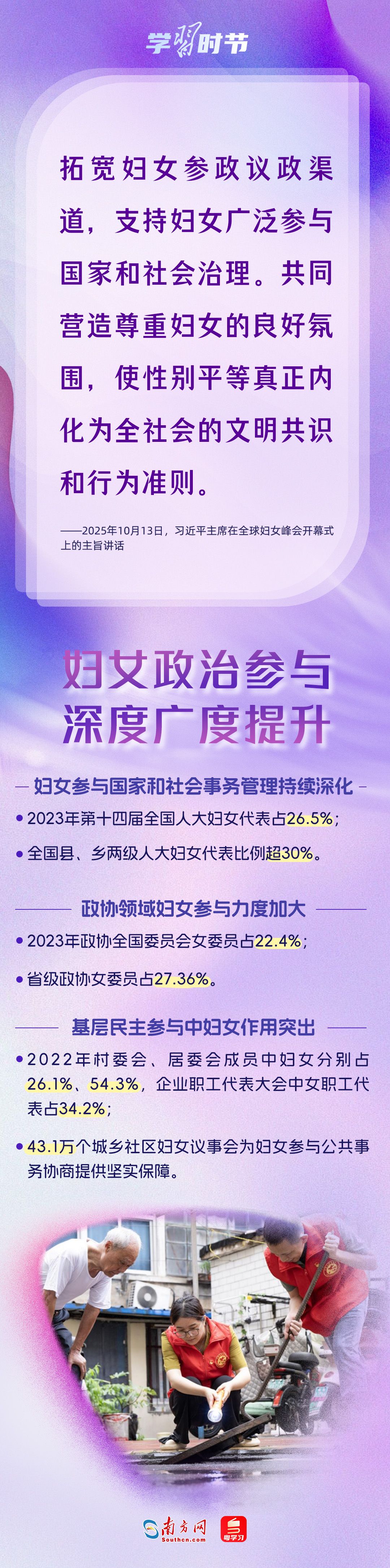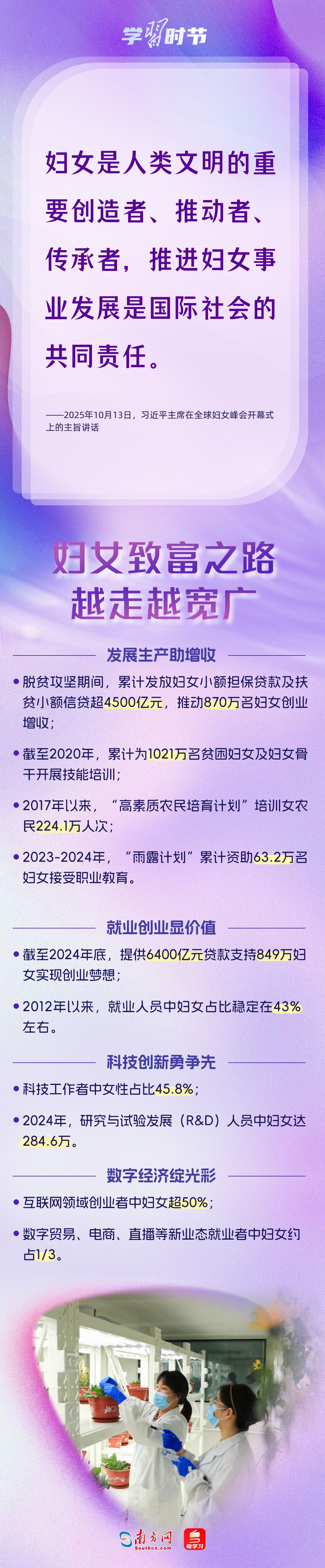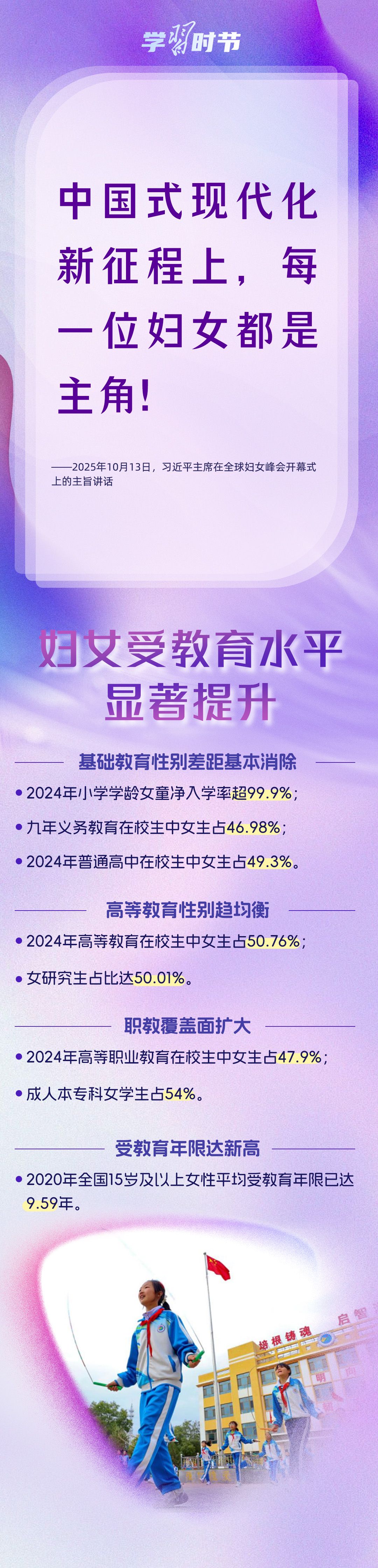 自1995年承办联合国第四次世界妇女大会后,我国坚定落实《北京宣言》《行动纲领》,始终是全球妇女事业重要参与者、推动者、引领者。进入新时代,我国妇女发展水平全方位跃升,为全球提供了中国样本。