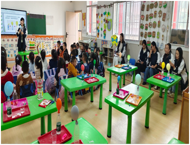 活动中,教师从幼儿年龄特点出发,细致揣摩、积极探索、精心设计教学环节。充分利用多媒体课件、教具以及创设生动有趣的教学情境等,激发了幼儿浓厚的学习兴趣。李梓萱老师小班音乐活动《秋天多么美》,跟着“棉桃姐姐”学咧嘴唱,伴着“稻花姐姐”练点头跳。章十佳章老师中班语言活动《甜甜的棒棒糖》,带着小熊手偶讲“独占糖不开心,分享后变快乐的故事”,还准备了彩色棒棒糖。李金玉老师大班科学活动《瓶子吹气球》,看瓶子“吹”起气球多神奇!孩子亲手把材料倒进瓶子,观察气球慢慢变大,还能听老师讲“气体让气球鼓起来”的小秘密。
