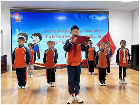 在庄严的出旗曲中,入队仪式正式开始。全体队员高唱《中国少年先锋队队歌》,歌声嘹亮。经大队委宣读名单,172名同学正式加入中国少年先锋队。老队员为新队员佩戴上鲜艳的红领巾,完成光荣的传承。