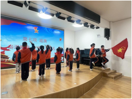 大队长杨佳妍同学带领新队员宣誓,大队辅导员陈梦玲老师带领新队员呼号,在铿锵有力的退旗曲中,本次入队仪式圆满完成。
