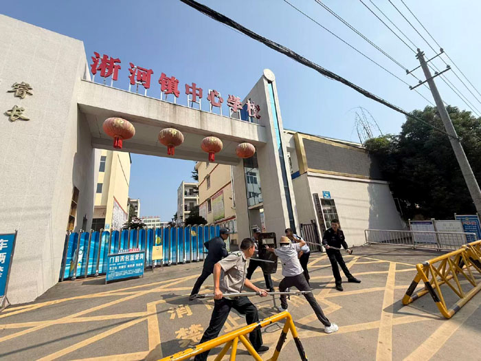 此次演练以“突发暴力袭击”为背景,一名“歹徒”试图强行闯入校园,学校保安立即启动应急预案,一边与“歹徒”周旋,一边报警求助。淅河派出所民警迅速赶到现场,与保安形成合围之势,利用防暴器械果断制服“歹徒”。整个过程反应迅速、配合默契,展现了校园安全队伍的专业素养与公安部门的高效联动。