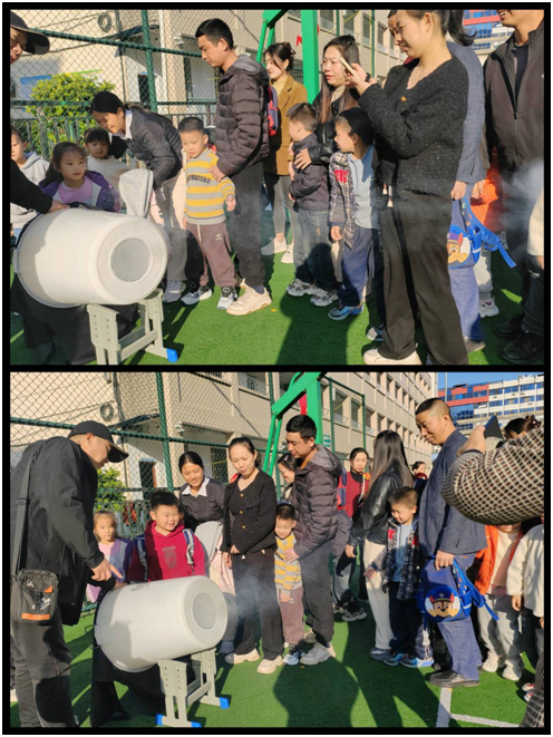 紧接着,来自“空气炮”实验将现场气氛推向高潮。讲解员用力拍打特制箱体,“砰”的一声,一个清晰的白色烟圈涡环急速射出,这一神奇的现象让孩子们目瞪口呆,随即爆发出热烈的掌声。在老师的邀请下,几位小朋友亲自上场体验,他们用力拍打桶身,看着自己亲手制造的“空气炮弹”飞向远方,脸上洋溢着兴奋与成就感,这些互动性极强的项目,不仅让孩子们直观感受到科学的魅力,更在他们心中播下了探索与创新的种子。