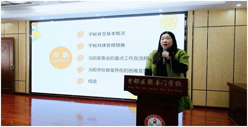 随后,家长们参加了学校组织的家委会会议。会议上,分管后勤副校长梅双向家委会成员们做了专题介绍。她详细介绍了学校的数字食堂建设,通过引入信息化、智能化的管理手段,实现对食材溯源、仓储管理、清洗切配、烹饪加工、餐食分发等全流程的精准监控与数据留痕,让食堂运营在阳光下运行。真正实现家校“聚力”,共同筑牢校园食品安全防线。