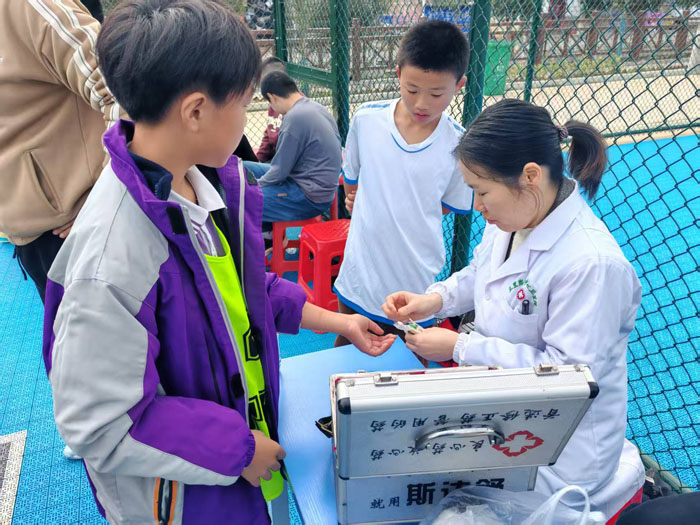 赛场边,三里岗镇卫生院的医护人员全程值守。他们设立临时医疗点,备足急救药品。医护人员随时待命,为球员们的健康安全保驾护航,成为赛场上最温暖的守护者。作为东道主,三里岗镇小学的办赛能力在细节中尽显:从赛前场地的反复调试、赛程表的精准排布,到赛中裁判的专业调度、参赛队伍的后勤保障,每一个环节都透着“以赛促交流”的用心。