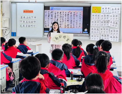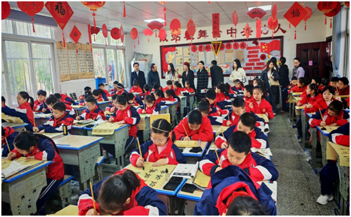 在成果展示环节,与会人员首先观看了纸韵童模表演,孩子们身着创意纸艺服饰,以灵动姿态展现艺术素养与动手能力;随后走进剪纸艺术工作坊展区,欣赏学生剪纸作品的同时,观摩现场创作过程,感受传统工艺与校园美育的融合;在书法展区,教联体各校学生优秀书法作品陈列于报恩书院前,更有书法社团学生现场书写,横竖撇捺,篆隶行楷,翰墨飘香间尽显扎实功底。走进书法实验班,领导和同仁们惊讶于孩子的硬笔日常书写水平之高,软笔整班书法课中学生的书写习惯和能力之强,这些成果也直观呈现了学校书法教学的阶段性成效。