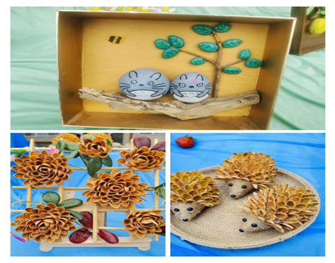 各个班级的展区主题鲜明,创意独具,巧思诠释环保理念。自然之趣:小班的《“果”然心动》将松果变为小黄牛、十二生肖;大一班的《玉你有约》让玉米芯化身栩栩如生的荷花与小动物,展现了自然材料的无限可能。