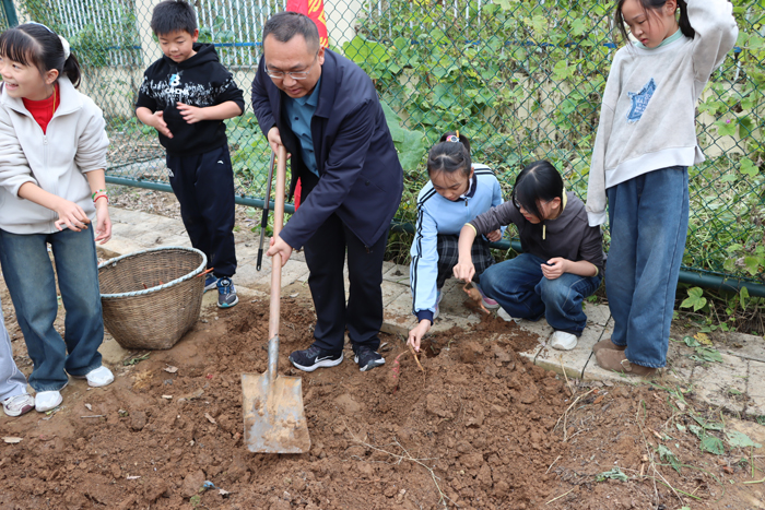 经过近一个小时的劳动,师生们共收获了数十筐新鲜甘薯。看着竹筐里大小不一、形态各异的甘薯,学生们纷纷拿起自己的“劳动成果”合影留念,笑容里满是丰收的喜悦。“挖甘薯的时候胳膊有点酸,但看到自己挖出来的甘薯,觉得特别有成就感,真是累并快乐着!”六年级学生龚梓瑞捧着甘薯开心地说。