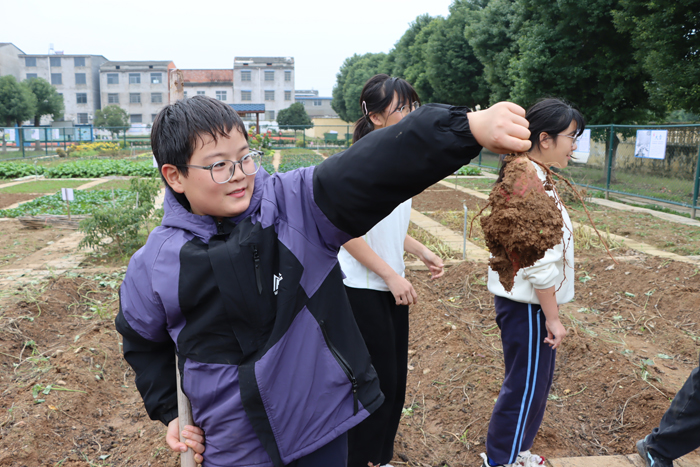 随着一声“开始”,学生们迅速分成若干小组,带着劳动工具、竹筐奔向甘薯地,劳动场面瞬间热火朝天。有的学生蹲在地里仔细辨认藤蔓走向,有的小心翼翼地清理薯周围的泥土,有的合力将埋在土里的“甘薯宝宝”挖出来,即使手上沾了泥土、额头渗了汗珠,也丝毫没有影响大家的热情。“老师您看!我挖到一个‘双胞胎’甘薯!”“我们组这筐都快装满啦!”田间不时传来学生们的欢呼雀跃声,一张张稚嫩的脸上满是专注与期待。