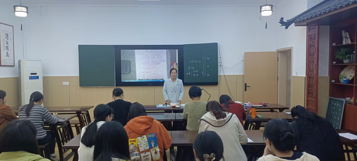 在硬笔书法培训环节,余老师以“规范书写基础”为核心,结合教学实例详细拆解了正确的硬笔执笔姿势,通过“示范+讲解”的方式,生动演示了硬笔顿笔的动作要领,从起笔、行笔到收笔的力度控制,再到书写节奏的把握与整体字型的结构优化,逐一进行指导,帮助教师们纠正日常书写中的常见误区。进入软笔书法培训阶段,余老师从工具选择切入,清晰介绍了羊毫、狼毫、兼毫三种毛笔的特性与适用场景,为教师们推荐了适合入门与提升的临摹字帖;培训重点围绕“中锋行笔”展开,通过反复示范提、按、顿、挫等核心笔法,引导教师们通过实操练习规范控笔能力,切实掌握软笔书写的关键技巧。