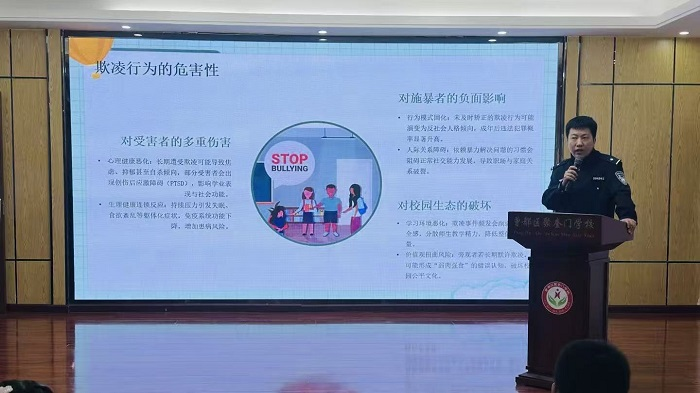 本次活动,学校通过校园网进行全程直播。活动中,朱警官直击校园安全两大核心议题。在“防欺凌”部分,他剖析欺凌形态,引导学生勇敢自救、智慧互助,坚决不做冷漠的旁观者;在“交通安全”部分,他结合“低头族”、车辆盲区等真实风险,传授实用避险守则,让规则意识深入人心。