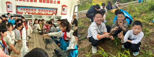 早上八点校门口集合,进行行前动员讲话,强调途中的安全,靠右行走,文明出行,到达后同学们零距离观摩国防装备模型,分批参观基地里的瓜果蔬菜,近距离观察植物生长,与学科融合,分组完成“摘一挖一捡”——摘辣椒、挖生姜、捡枯枝落叶。辣椒地里,孩子们左手握柄、右手轻拧,一串串“红灯笼”落进篮子;生姜垄旁,大家蹲身、刨土、拔茎,体验“姜还是老的辣”的泥土力量;林间小道,枯枝落叶被扎成捆,堆在角落。