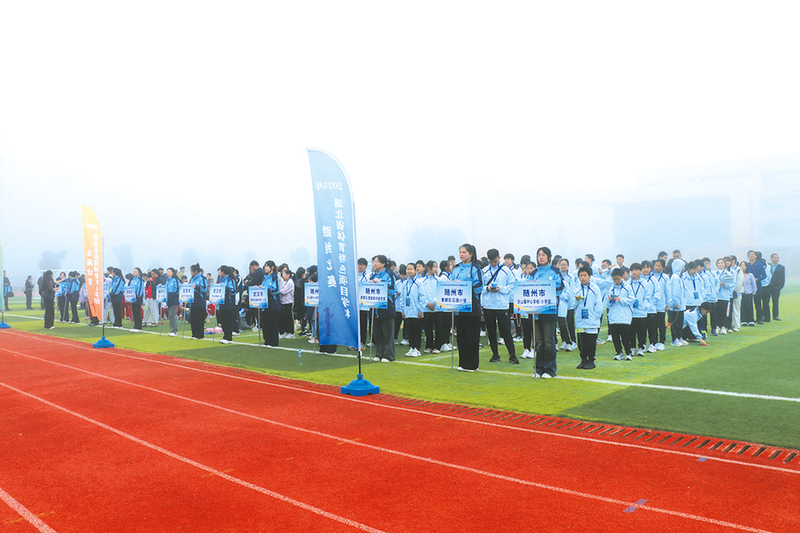 赛事启幕当日,随州被一层薄雾轻笼,而曾都区编钟小学门前早已热闹非凡。一支由曾都区白云湖小学57名学生组成的鼓号队,身着整齐制服,昂首挺胸奏响《出旗曲》《退旗曲》。鼓点铿锵穿越薄雾,号声嘹亮划破晨空,稚嫩的脸庞上满是认真,用最热情的姿态迎接来自湖北省四面八方的参赛师生。一旁的迎宾举牌队伍里,“仙桃市第二小学”“麻城市第六小学”“武汉市青山区钢花小学”等校名格外醒目,成为连接各地校园体育力量的生动纽带。