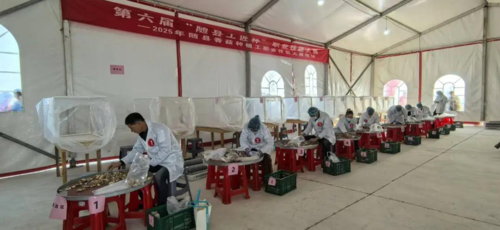 大赛设置香菇种植、中式烹饪、中式面点三大项目,重点考察选手的专业技能与实操能力。在香菇种植赛场,选手们规范、熟练地完成菌棒接种与等级筛选,展现出“随县香菇种植工”劳务品牌的高标准、严要求。