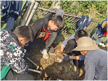 当日午后,暖阳洒满田野,红薯地里的翠绿叶片随风摇曳。平日里握笔研学的同学们,带着好奇与期待踏入田间,在基地老师的耐心指导下,学习顺着红薯生长方向松土、拔根的技巧。大家俯下身来,与泥土亲密接触,小心翼翼地拨开薯周围的泥土,再合力将红薯连根拔起。当一个个带着泥土芳香的红薯破土而出时,田间不时回荡起同学们的惊喜欢呼声。