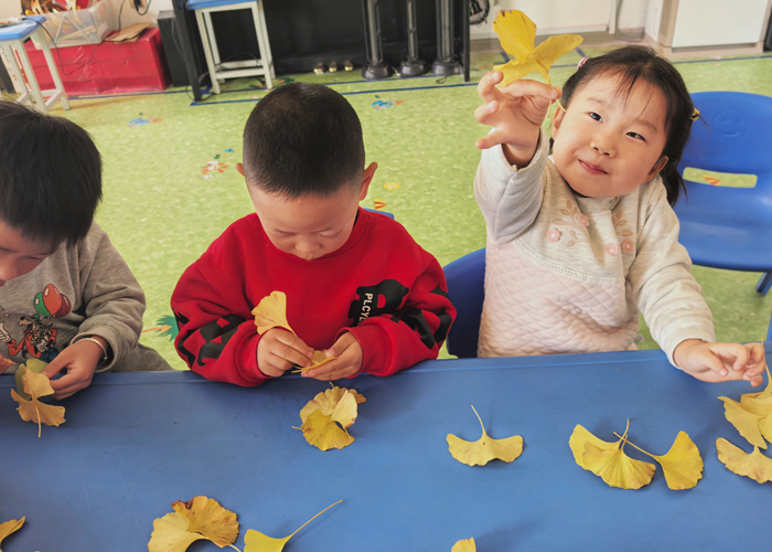活动始于一场“自然观察课”:老师带着孩子们围站在银杏树下,引导大家观察叶片“像小扇子”的形状、触摸叶片的手感,还借着飘落的黄叶,和孩子们聊起“秋天为什么树叶会变黄”的小知识——这恰好呼应了指南中“支持幼儿在接触自然中积累感性经验”的要求。随后在活动室里,孩子们用金黄落叶或合作或独立DIY“银杏皇冠”,有的叠出“花瓣形”装饰,有的围成一个圆形。老师巡回指导,既保护创作自主性,也落实指南“鼓励幼儿用多元材料表达自己的想法”的建议。