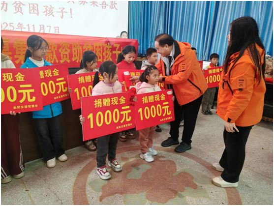 捐赠仪式上,爱心团队将善款送至学子手中,校长杨伟代表学校赠送“传国学功德无量,捐善款大爱无疆”锦旗致谢。吴伯胜分享自身奋斗经历,勉励学子勤学奋进:“教育是阻断贫困代际传递的钥匙,家乡的未来需要你们书写。”中心学校校长程贵兵寄语受助学生,将关爱化为动力,以梦想点亮人生。
