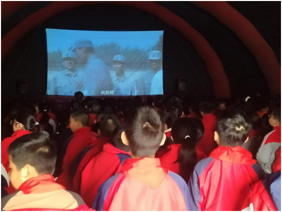 活动前期,学校精心筹备流动影棚搭建工作,联合电影公司专业团队调试设备、挑选影片,确保观影体验与教育效果双提升。放映过程中,学生们全神贯注,随着剧情发展共情共鸣:看到王二小为掩护乡亲与八路军,机智引敌入包围圈时,眼中满是敬佩;目睹《神勇投弹手》里战士们冲锋陷阵、浴血奋战的场景,不少同学悄悄攥紧拳头。光影交织间,革命先烈的英雄事迹深深烙印在学生心中。