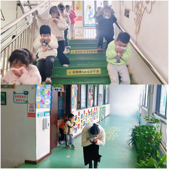 演练前,老师通过生动的动画、有趣的儿歌,向小朋友们讲解了消防安全知识。“火灾来了怎么办?”“用湿毛巾捂住口鼻,弯腰走安全通道。”小朋友们听得认真,记得牢,一个个都成了“安全小卫士”。警报声响起,孩子们在老师的带领下,不推不挤,快速有序地从教室撤离到安全地带。看,他们一个个眼神坚定,动作标准,就像真正的消防员一样勇敢!