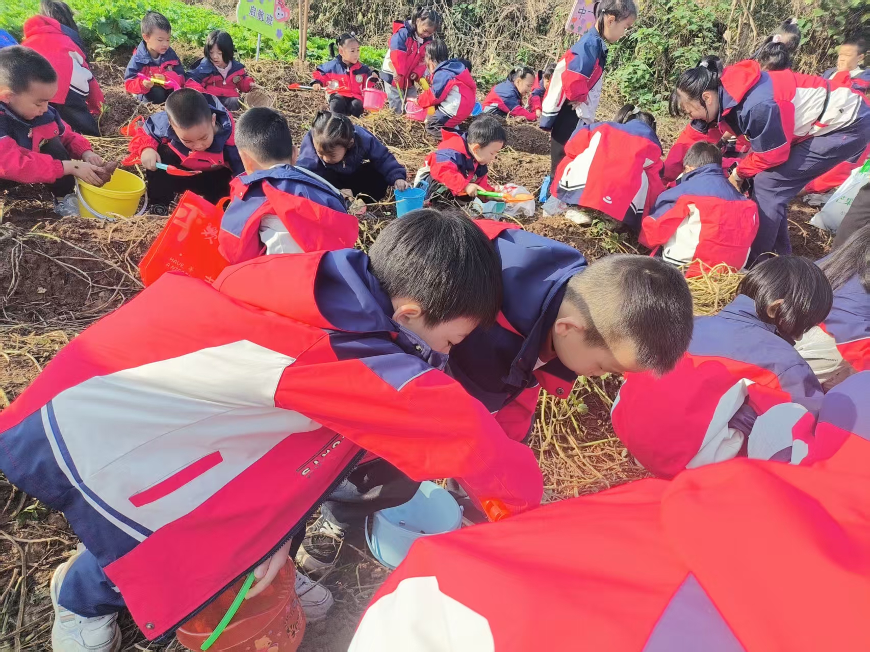 秋阳正好,童趣盎然。活动首日,该园二百余名幼儿在老师的带领下走进红薯种植基地,开启了“野外挖红薯”实践。田间地头里,孩子们带着好奇与兴奋,在老师的专业指导下,认真学习翻藤、扒土、辨识红薯位置的技巧,挥舞着小工具铲土、挖掘、掏取,亲身感受从土地中收获果实的喜悦。大家分工协作、互帮互助,忙得不亦乐乎,在亲近自然的过程中不仅锻炼了动手能力,更体会到了劳动的乐趣。
