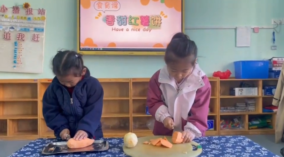 趣味延续,实践升温。活动次日的“红薯游戏课”同样精彩纷呈。小班幼儿通过观察、触摸认识红薯外形特征,用画笔勾勒心中的红薯模样;中大班则聚焦“舌尖上的红薯”,开展沉浸式实践课程。孩子们全程动手参与清洗、刮皮、切片、揉制红薯泥,亲手制作红薯丸、红薯饼,在体验美食制作的过程中提升了生活技能。大一班余承峻小朋友在活动后有感而发:“做红薯饼太不容易了,爸爸妈妈做饭真辛苦,我以后再也不挑食,要爱惜粮食。”这番稚嫩又真诚的话语通过视频分享至班级群后,引发家长们广泛共鸣与点赞。