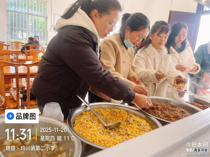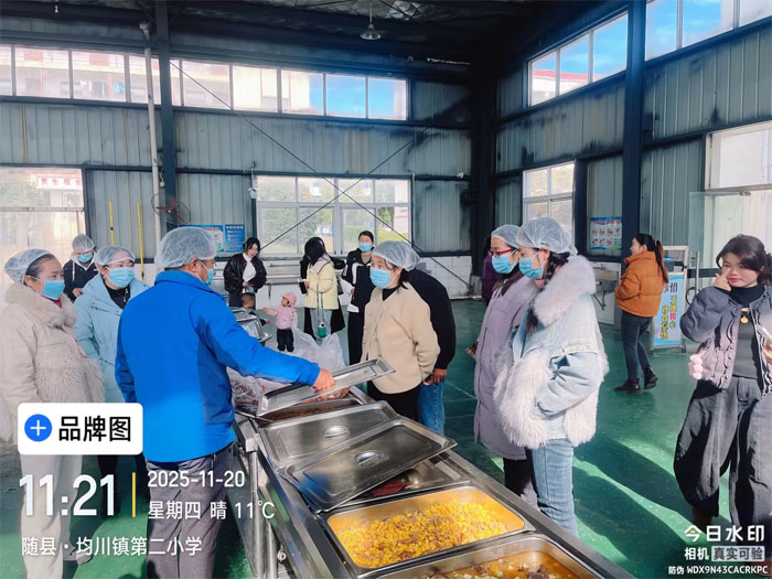 随州新闻网讯 (通讯员刘 升、胡安元)校园餐食的安全与营养,始终是家长心头的牵挂,也是学校育人工作的重中之重。为构建 “阳光食堂”,深化家校协同育人,11 月 20 日,均川镇第二小学以 “家长开放日” 为契机,开展了一场别开生面的家长试餐陪餐活动,邀请30余位家长代表沉浸式参与校园膳食管理,在 “亲眼见、亲口尝、亲身评” 中,为学生的 “舌尖安全” 画上一道安心的 “对勾”。
