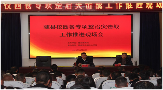 随州新闻网讯 (通讯员孙祥军)11月21日,随县校园餐专项整治突击战工作推进现场会在洪山镇中心学校隆重召开。县教育局主要领导及各股室负责人,全县各中心学校校长、各中小学、幼儿园校(园)长代表共计150余人齐聚一堂,通过“现场观摩学样板、交流发言促提升、工作通报明底数、领导讲话定方向”的闭环模式,凝聚共识、汇聚合力,推动随县校园食品安全工作提质增效。