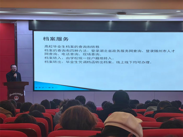 随州新闻网讯 (通讯员黄子滢)为精准对接青年大学生就业需求,破解求职困惑,传递政策红利,11月20日下午,由随州市人社局主办、随州市人才服务中心承办的一场干货满满的“政策进校园”宣讲会在随州职院顺利举行。活动聚焦就业指导、政策解读与互动答疑三大核心环节,为即将踏入职场的毕业生们送上了一份“就业赋能大礼包”,现场氛围热烈,反响良好。