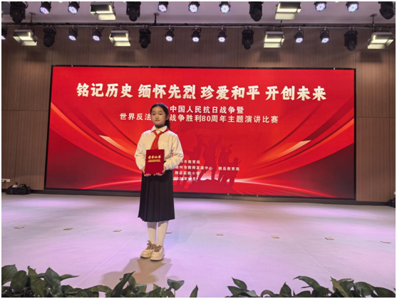 比赛现场,谢菁一以极具感染力的演绎,将观众带回那段山河破碎、浴血抗争的峥嵘岁月。她的演讲时而凝重缅怀先烈,时而激昂展望未来,从历史细节到城市变迁,从苦难记忆到和平愿景,生动诠释了“铭记历史、缅怀先烈、珍爱和平、开创未来”的核心主题。精彩的表现不仅赢得了评委的一致高分认可,更让台下师生产生了强烈的情感共鸣,沉浸在跨越时空的精神洗礼中。