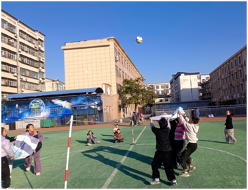 随着哨声响起,比赛正式开始。“快,再抬高一点!”“稳住,别让球掉了!”各组队员默契配合,原本柔软的床单在众人合力下变得“有力”,排球在床单间来回穿梭。当床单松动、排球落地时,学生也亳不气馁,笑着总结经验,重新上阵;当四人小组偶尔接住传过来的球时,整个小组喜气洋洋,周围也传来阵阵喝彩声。