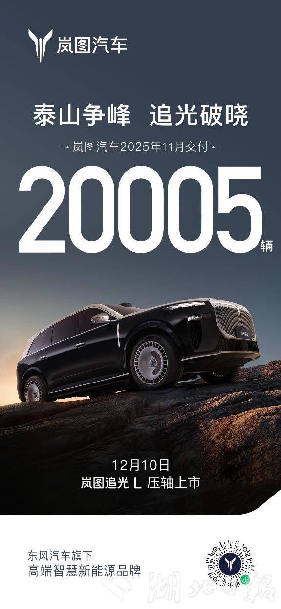 湖北日报讯(记者左晨、通讯员张莹莹)12月1日,岚图汽车发布11月销量数据,单月交付20005辆,同比增长84%,再创历史新高,实现“十连涨”,保持高质量发展强劲势头。