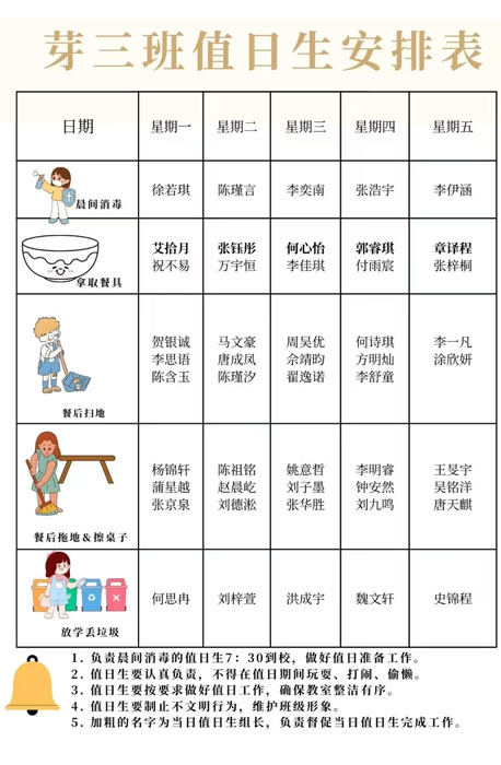 值日工作被细化为“晨间消毒”“餐具准备”“餐后整理”“扫地拖地”“垃圾归类”等五个小岗位,每个孩子都有属于自己的“清洁使命”。早晨,消毒小能手认真擦拭每一张桌面;餐前,餐具组的小朋友把碗勺摆放得整整齐齐;餐后,清扫小队迅速出动,清理饭粒、擦拭桌椅;放学时,垃圾小管家还会仔细检查分类情况。安排表上特别用加粗字体标出每日组长,带动小伙伴一起完成任务,小小的分工里,藏着大大的责任感。