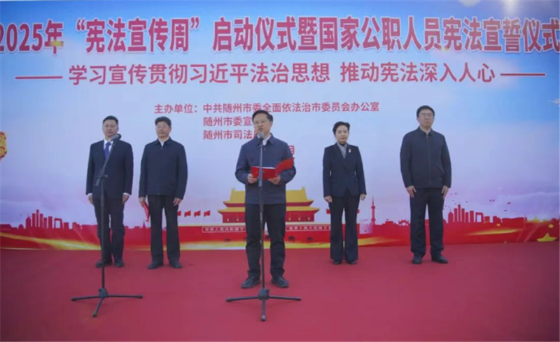 今年12月4日是第十二个国家宪法日。12月3日,我市举行2025年“宪法宣传周”启动仪式暨公职人员宪法宣誓仪式,启动系列普法宣传活动。市委副书记吴晓军出席活动并强调,要深入学习贯彻党的二十届四中精神和习近平法治思想,奋力推进更高水平的法治随州建设,引导社会各界尊法学法守法用法,为“整体提升环境 建功支点建设”营造更好法治环境。