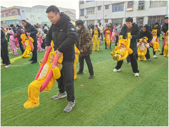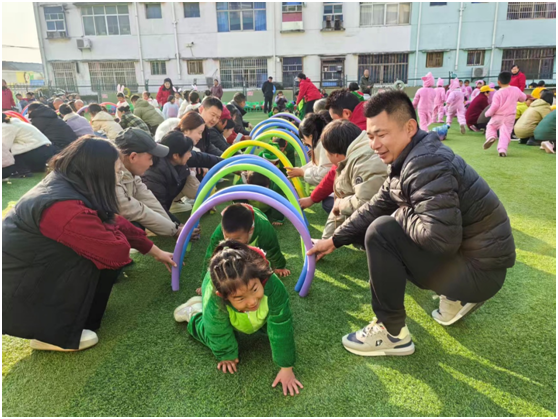 亲子互动环节暖意融融。“大手牵小手,共翻浪浪山”游戏中,家长与孩子默契配合,完成“泡沫棒传递”、“趣味扔沙包”等项目。大手握小手的身影满是温情,孩子们在奔跑中释放活力,在协作中学会分享,笑脸成为冬日里的动人风景。