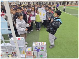 活动现场宛如一个充满魔力的英语乐园。学生们利用牛奶盒亲手制作的“方块单词画”引人注目,纸盒改造的方块上,苹果、猴子、小风扇等卡通图案与对应英文单词巧妙结合,既是学习卡片,也是创意作品,展现了孩子们的巧思与热情。