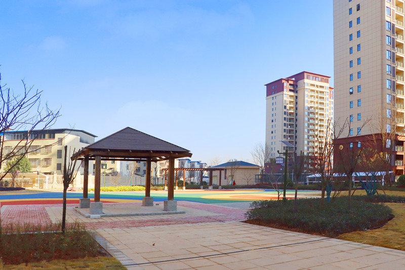 在配套设施方面,小区利用地面空间建设了大型休闲广场,设有休闲凉亭和数百平方米的塑胶运动场,满足全龄段居民休闲健身需求。各楼栋单元入口均设有非机动车停车棚,方便居民日常出行。