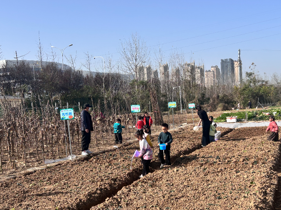 凭借“农耕体验+实践教学”的独特优势,白桃村共享菜园已与御山墅幼儿园、小晶灵国际幼儿园、齐星幼儿园等6所幼儿园签订长期合作协议,成为固定农耕研学基地。每个班级认定一块地,老师们依托田间特色资源量身打造沉浸式研学课程,带领小朋友辨识随州本地作物、观察蔬菜生长规律、参与农事操作,在田间地头践行劳动教育,在趣味实践中收获成长与快乐。