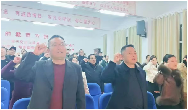 榜样的力量催人奋进,誓言的初心更需铭记。在观看完最美教师事迹后,活动进入“铮铮誓言践初心”集体宣誓环节。全体教职工起立,右手举拳,庄严宣誓:“忠诚党的教育事业,贯彻党的教育方针,履行教师神圣职责,遵守教师职业道德……做有理想信念、有道德情操、有扎实学识、有仁爱之心的‘四有’好老师,为培养担当民族复兴大任的时代新人而努力奋斗!”铿锵有力的誓言回荡在会场,既是对教育使命的郑重承诺,更将榜样力量转化为坚守师德、潜心育人的坚定决心。