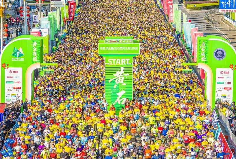 14日,2025黄石半程马拉松在人民广场鸣枪开跑。