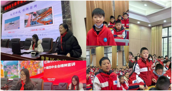 宣讲环节中,三位老师结合党的二十届四中全会核心要义与少先队员认知特点,量身定制宣讲内容,让抽象理论变得生动可感。沈俊俊校长以《在奋斗中,美好的愿望接连实现》为题,从个人小愿望与国家大发展的关联切入,阐释 “奋斗是实现一切愿望的根本路径”,勉励队员们以脚踏实地的努力积攒成长力量;孙攀老师聚焦全会科技创新部署,在《从一骑红尘到万物互联》的宣讲中,通过古今生活场景对比,直观展现我国科技跨越式发展成果,激发队员 “科技报国” 志向;张孜涵老师以《青春筑梦,强国有我》为主题,结合少年英雄事迹与榜样案例,解读 “培养担当民族复兴大任的时代新人” 的深刻内涵,引导队员将个人成长融入民族复兴征程。宣讲结束后的互动环节,少先队员们围绕奋斗精神践行、科技创新参与、红色基因传承等问题踊跃提问,三位老师的耐心解答进一步深化了队员们的理解感悟,现场氛围热烈融洽。