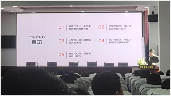 讲座现场,吕孝纪营养师化身亲切易懂的 “营养导师”,从中学生生长发育的特殊需求出发,以全天一日三餐的能量供给和营养素配比为核心,细致拆解了该年龄段所需的主食、蔬菜、肉蛋奶等各类食物的适宜种类与摄入量。他结合配餐 “多样化、均衡化、适量化” 的核心原则,用通俗的语言讲解了如何通过合理搭配食材,实现营养互补,满足身体发育和学习生活的双重需求。