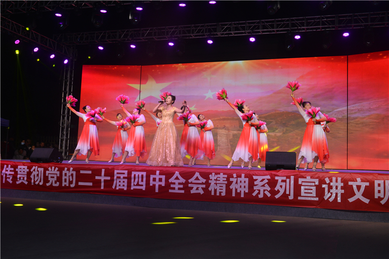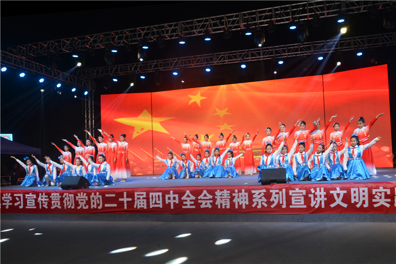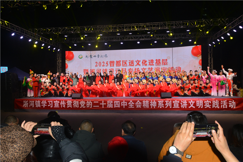 晚会在淅河镇第一小学表演的《鼓舞中国》中拉开活动序幕,淅河镇综合文化服务中心舞蹈队,舞蹈《太阳出来喜洋》,烈山社区艺术团,快板《随州处处好风光》,淅河镇云龙社区舞蹈队,歌伴舞《幸福中国一起走》,淅河镇第一小学,舞蹈《成长在祖国的怀抱里》,淅河镇刘莲威风锣鼓艺术团,非遗表演《打莲响》,淅河镇综合文化站银杏艺术团,情景剧《清洁家园美如画》,淅河镇大庙村书记冯享国独唱《画你》,淅河镇二棉社区舞蹈一队,舞蹈《祝福你盛世中华》,淅河镇土城村金秋舞动队,秧歌舞《红歌大连唱》,曾都区中医医院,朗诵《白衣执手,暖照新元》,淅河镇综合文化站舞韵艺术团,舞蹈《江山》将活动推向高潮。老街社区居民王明轩说,现在党的政策好,我们淅河镇经常开展大型文艺活动,送戏下乡,送电影下乡保障了人民群众的文化生活,让我们能够欣赏高雅艺术,我们住在这里开心,这也是淅河镇开展新时代文明实践活动的成果展示,丰富了我们居民们的文化生活。