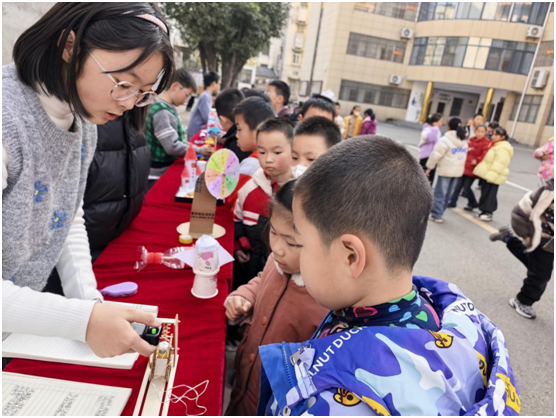 活动中,参展学生主动化身“小小解说员”,向参观的学生介绍自己作品的设计思路、制作过程。“为什么我轻轻一按,垃圾桶盖就会自动打开呢?”在动手实践与思考中,引导学生去解锁科学原理,吸引更多的学生去探索科学奥秘。